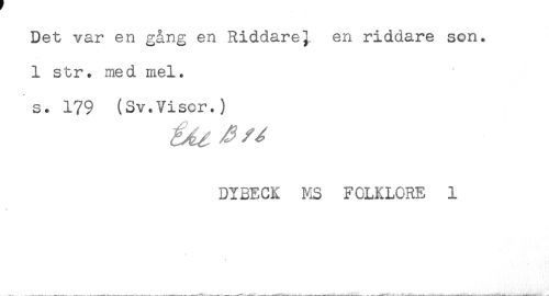 //// Det var en gång en Riddare]- en riddare son. //// 1 str. med mel. //// s. 179 (Sv.Visor.) //// DYBECK MS FOLKLORE 1 //// * ////