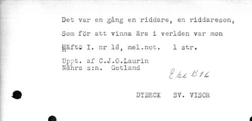 //// " ' ' ' : . .. - //// Det var en gång en riddare, en riddareson, //// Som för att vinna ära i verlden var mon //// ^äftö nr 13, mel.not. 1 str. //// - . . . //// Uppt. af C.J.O.Laurin //// Nährs s:n. Gotland //// ^ DYBECK SV. VISOR ////