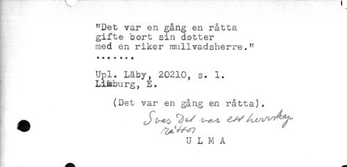 //// "Det var en gång en råtta //// gifte bort sin dotter //// med en riker mullvadsherre." //// n //// Upl. Läby, 20210, s. 1. //// Li&burg, E. //// (Det var en gång en råtta). //// U L M A ////