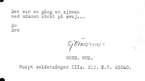 //// Det var en gång en sjöman //// med mössan käckt på svaj... //// Bo //// Bro //// /it/ ' //// NORD. MUS. //// Mskpt soldatsånger IIIs. 233- E.U. 25040. ////