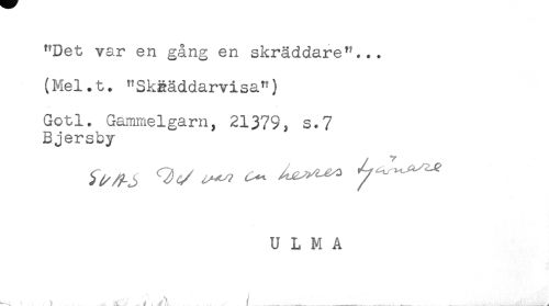 //// "Det var en gång en skräddare"... //// (Mel.t. "Skääddarvisa") //// Gotl. Gammelgarn, 21379, s.7 //// Bjersby //// U L M A //// ^ - ) . \....... i t ....... t .......___—....,,...:_____.____...^tj ////