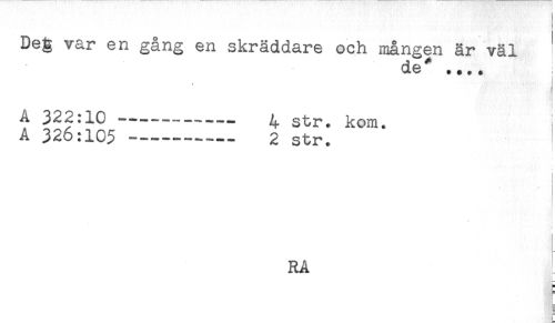 //// Deg var en gång en skräddare och mången är väl //// de* //// w * * + //// < //// //// /A 322:10 —---- 4 str. kom. //// A 326:105----- 2 str. //// RA ^ //// i //// t= ////