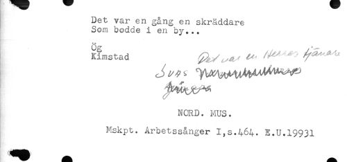 //// Det var en gång en skräddare //// Som bodde i en by... //// Ög z * - //// Kimstad ^ ^ " ' //// NORD. MUS. //// Mskpt. Arbetssånger I,s.464. E.U.19931 ////