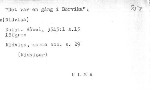 //// "Det var en gång i Börvika".. //// ^(Nidvisa) //// Dalsl. Håbol, 3545:1 s.15 //// Löfgren //// Nidvisa, samma acc. s. 29 //// (Nidvisor) //// < //// U L M A //// i //// < ////