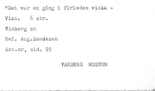//// "Det var en gång i förleden vicka - //// Visa. 6 str. //// Vinberg sn //// Ref. Aug.Bondeson //// Acc.nr, sid. 95 //// VARBERG MUSEUM ////