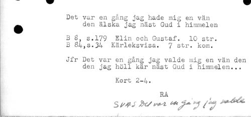 //// '.'' //// B)! * ^ //// Det var en gång jag hade mig en vän //// ^ den älska jag näst Gud i himmelen //// B g, s.179 Elin och Gustaf. 10 str. //// B 84;S.34 Kärleksvisa. 7 str. kom. //// Jfr Det var en gång jag valde mig en vän den //// den jag höll kär näst Gud i himmelen... //// Kort 2-4. ////