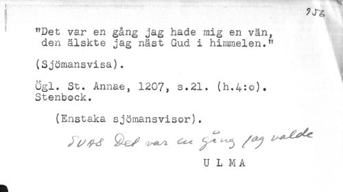 //// 1 7JH //// t! //// "Det var en gång jag hade mig en vän, //// den älskte jag näst Gud i himmelen." //// '!, .'. i')''''] //// (Sjömansvisa). //// ögl. St. Annae, 1207, s.21. (h.4:o). //// Stenbock. //// (Enstaka sjömansvisor). ////