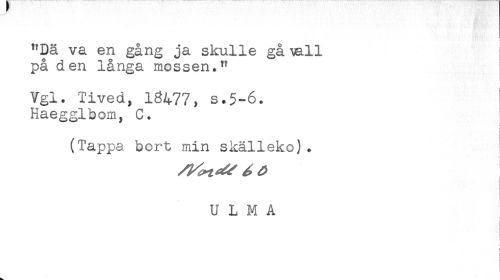 //// "Dä va en gång ja skulle gå wll //// på den långa mossen." //// Vgl. Tived; 13477, s.5-6. //// Haegglbom, C. //// i //// i //// < //// ) //// (Tappa bort min skälleko). //// i //// U L M A //// ) //// i ////
