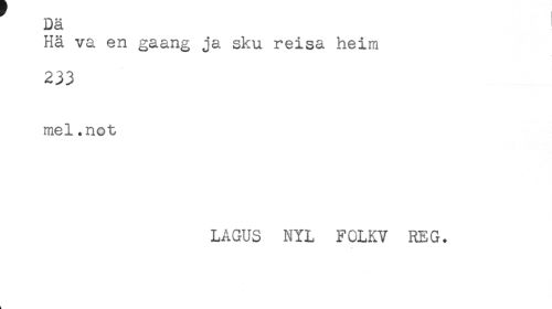 //// Dä //// Hä va en gaang ja sku reisa heim //// 233 //// mel.not //// LAGUS NYL FOLKV REG. //// k ////
