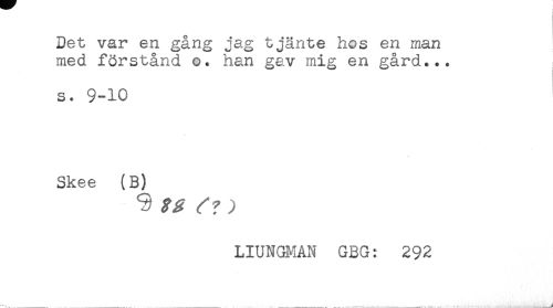 //// Det var en gång jag tjänte hos en man //// med förstånd o. han gav mig en gård... //// s. 9-10 //// Skee (B) //// LIUNGMAN GBG: 292 ////
