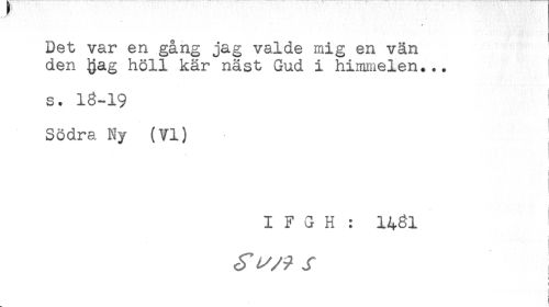 //// Det var en gång jag valde mig en vän //// den §ag höll kär näst Gud i himmelen... //// s. 18-19 //// Södra Ny (VI) I //// I F G H : 1481 //// ! ////