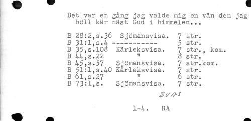 //// Det var en gång jag valde mig en vän den jag //// höll kär näst Gud i himmelen... //// B 23:2,s.36 Sjömansvisa. 7 str. //// B 31:1,s.4----5 str. //// B 35,s.103 Kärleksvisa. 7 str., kom. //// B 44,s.22 " 3 str. //// B 45,s.57 Sjömansvisa. 7 str.kom. //// B 51:1,s.40 Kärleksvisa. 7 str. //// B 6l,s.27 " 6 str. //// B 73:1,s. Sjömansvisa. 7 str. //// 1-4. RA ////