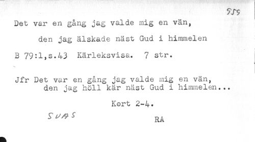 //// Det var en gång jag valde mig en vän, //// den jag älskade näst Gud i himmelen //// B 79:1,s.43 Kärleksvisa. 7 str. //// < //// Jfr Det var en gång jag valde mig en vän, //// den jag höll kär näst Gud i himmelen... //// Kort 2-4. //// f ^ ' RA ////