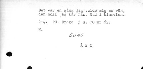 //// Det var en gång jag valde mig en vän, //// den höll jag kär näst Gud i himmelen. //// 2:4. PU. Brage $ s. 70 nr 62. //// N. //// ' //// ÅBO //// * ////
