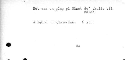 //// Det var en gång på Näset de* skulle bli //// kalas //// .... //// A 140:3 Ungdomsvisa. 6 str. //// ; ////