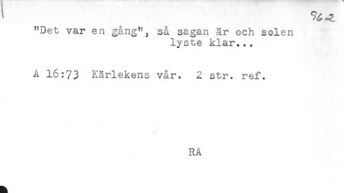 //// 1 - //// "Det var en gång", så sagan är och solen //// lyste klar... //// A 16:73 Kärlekens vår. 2 str. ref. //// *: i ' //// RA ////