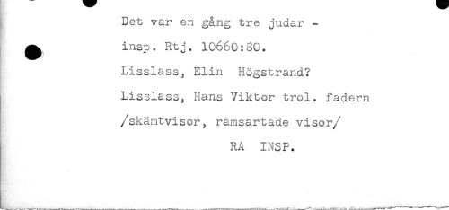 //// Det var en gång tre judar - //// ^ insp. Rtj. 10660:80. //// Lisslass, Elin HGgstrand? //// Lisslass, Hans Viktor trol. fadern //// /skämtvisor, ramsartade visor //// /RA INSP. ////