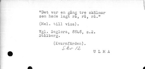 //// ! //// "Det var en gång tre skälmar //// som hade lagt rå, rå, rå." //// (Mel. till visa). //// Vgl. Seglora, s.2. //// Stålberg. //// (Kvarnfärden). //// ^ U L M A ////