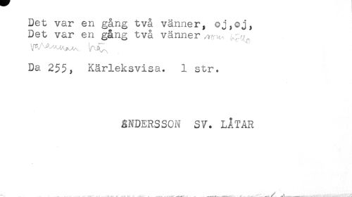 //// Det var en gång två vänner, oj,cj, //// Det var en gång två vänner ,; //// Da 255, Kärleksvisa. 1 str. //// ANDERSSON SV. LÅTAR //// * , - t . . ^ .. .. . -- ^ . ----* ' ; . . . ...... ----...... ////