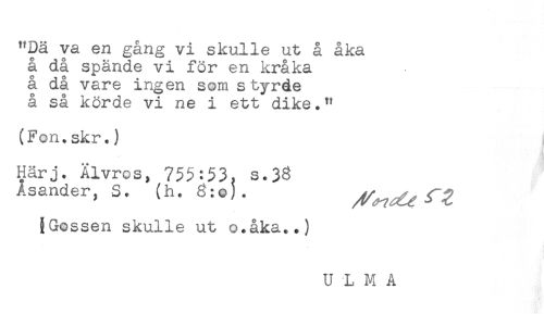//// "Dä va en gång vi skulle ut å åka //// å då spände vi för en kråka //// å då vare ingen som styrde //// å så körde vi ne i ett dike." //// (Fon.skr.) //// Härj. Älvrcs, 755:53, s.33 //// Asander, S. (h. 3:o). //// Gossen skulle ut o.åka..) //// U L M A ////