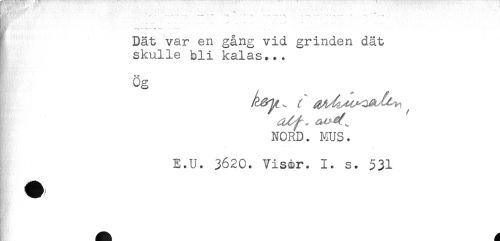 //// ' Dät var en gång vid grinden dät //// skulle bli kalas... //// Ög //// NORD. MUS. //// E.U. 3620. Visor. 1. s. 531 ////