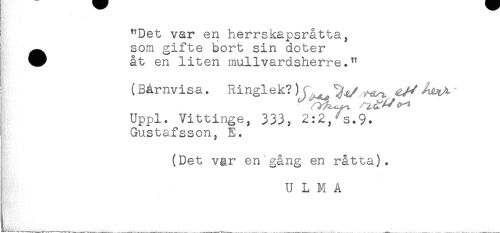 //// ; //// ^ "Det var en herrskapsråtta, //// ^ som gifte bort sin doter //// ^ åt en liten mullvardsherre." //// (Bårnvisa. Ringlek?) //// Uppl. Vittinge, 333, 2:2/s.9. //// Gustafsson. E. //// (Det vg,r en gång en råtta). //// U L M A ////