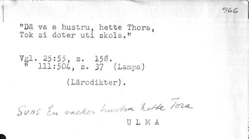 //// - * . j //// "Dä va e hustru, hette Thora, //// Tok si doter uti skola." //// i //// i //// t //// Vgl. 25:55, s. 153. //// " 111:504, s. 37 (Lampa) //// ! //// (Läredikter). //// U L M A ////