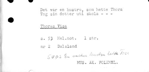 //// { Det var en hustru, som hette Thora //// ' Tog sin dotter uti skola - - - //// ! Thoras Visa //// ] s. 53 Mel.not. 1 str. //// I nr 2 Dalsland //// j MUS. AK. FCLKHEL. //// . * " *" ////