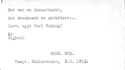//// Det var en Januarinatt. //// * i //// det drunknade en skräddare... //// (not. uppt Carl Viking) //// Sm //// Äighult //// NORD. MUS. //// Mskpt. Rallarvisor, E.U. 18534 ////