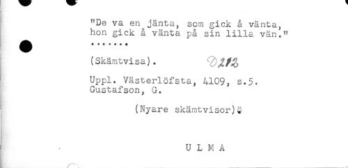 //// ! //// "De va en jänta, som gick å vänta, //// hon gick å vänta på sin lilla vän." //// (Skämtvisa). //// Uppl. Västerlöfsta, 4109, s.5< //// Gustafson^ G. //// (Nyare skämtvisor)$ //// n //// U L M A ////
