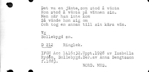 //// Det va en jänta,som stod å vänta //// Hon stod å vänta på vännen sin. //// Men när han inte kom //// Så vände hon sig om //// Och tog en annan till sin kära vän. //// Vg //// Bollebygd sn. //// D 212 Ringlek. //// IFGH Acc 1416:32.Uppt.1928 av Isabella //// Rydén, Bollebygd.Ber.av Anna Bengtsson //// f.1883. //// NORD. MUS. ////