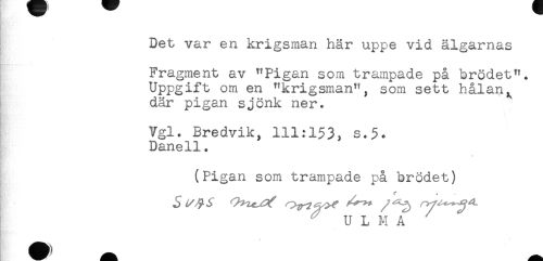 //// Det var en krigsman här uppe vid älgarnas //// Fragment av "Pigan som trampade på brödet". //// Uppgift om en "krigsman", som sett hålan, //// där pigan sjönk ner. //// j. //// Vgl. Bredvik, 111:153, s.5< //// Daneli. //// (Pigan som trampade på brödet) //// r //// ^^ //// U L M f //// - ////