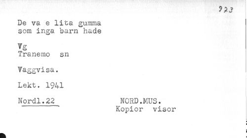 //// 72J //// De va e lita gumma //// som inga barn hade //// Vg //// Tranemo sn //// Vaggvisa. //// . //// Lekt. 1941 //// Nordl.22 NORD.MUS. //// Kopior visor //// I //// t //// L //// H //// H ////