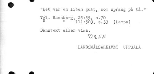 //// H H) //// "Det var en liten gutt, som sprang på tå." //// . //// Vgl. Ransberg, 25:5$, s.70 //// " " 111:503, s.33 (Lampa) //// Danstext eller visa. //// LANDSMÅLSARKIVET UPPSALA ////