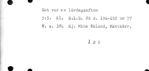 //// Det var en lördagsafton //// 5:5. Kl. S.L.S. 82 s. 194-195 nr 77 //// N. s. 384 Sj. Mina Eklund, Mattkärr. //// ÅBO ////