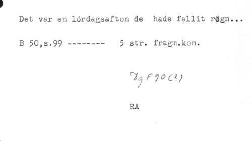//// Det var en lördagsafton de hade fallit rggn... //// B 50,s.99 --- 3 str. fragm.kom. //// RA ////