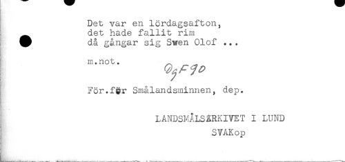 //// Det var en lördagsafton, //// det hade fallit rim //// ^ då gångar sig Swen Olof ... //// m.not. //// För.f§r Smålandsminnen, dep. //// LANDSMÅLSARKIVET I LUND //// SVAKop ////