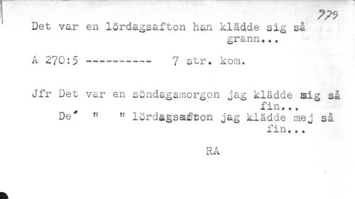 //// ] //// Det var en lördagsafton han klädde sig så //// grann... //// A 270:5 — 7 str. kom. //// Jfr Det var en söndagsmorgon jag klädde mig så //// ^ fin... //// De " " lördagsafton jag klädde mej så //// fin... //// RA //// * ////