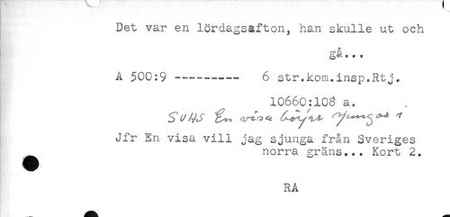 //// Det var en lördagsafton, han skulle ut och //// ! //// gå... //// A $00:9 -—---- 6 str.kom.insp.Rtj. //// 10660:103 a. //// Jfr En visa vill jag sjunga från Sveriges //// norra gräns... Kort 2. //// RA ////