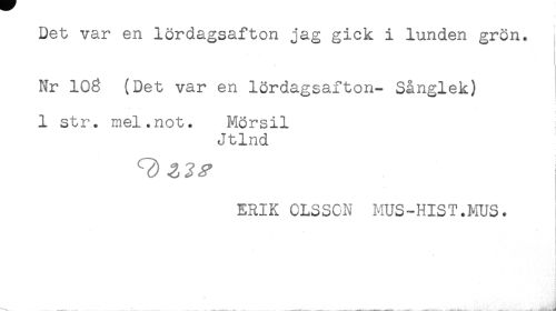 //// Det var en lördagsafton jag gick i lunden grön. //// Nr 106 (Det var en lördagsafton- Sånglek) //// 1 str. mel.not. Mörsil //// Jtlnd //// ERIK OLSSON MUS-HIST.MUS. ////
