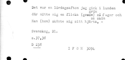 //// Det var en lördagsafton jag gick i lunden //// grön //// där mötte mig en flicka (gowse) så fager och //// så skön //// Han (hon) skänte mig sitt hjärta, - //// Svanskog, Dl. //// . //// S.37,33 //// D 233 //// --I F G H 3094 ////