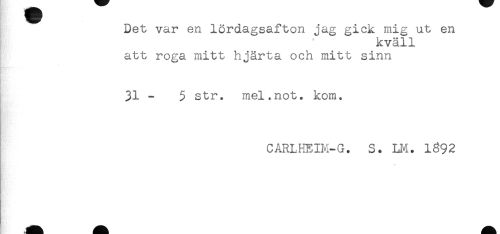 //// Det var en lördagsafton jag gick mig ut en //// kväll //// att roga mitt hjärta och mitt sinn //// . //// 31 - 5 str. mel.not. kom. //// CARLHEIM-G. S. LM. 1892 ////