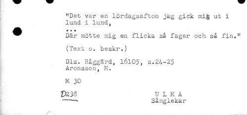 //// I "Det var en lördagsafton jag gick mig ut i //// lund i lund, //// ^^^ * * * //// ^ Där mötte mig en flicka så fager och så fin." //// I (Text o. beskr.) //// Dis. Råggärd, 1610$, s.24-25 //// Aronsson, M. //// M 30 //// 2)238 U L M A //// --^ Sånglekar ////