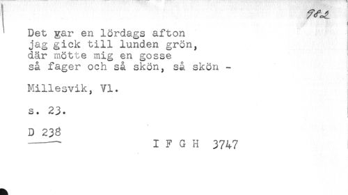 //// ^ Det gar en lördags afton //// jag gick till lunden grön, //// där mötte mig en gosse ^ //// så fager och så skön, så skön - //// Millesvik, VI. //// s. 23. //// i //// D 238 //// ----I F G H 3747 ////