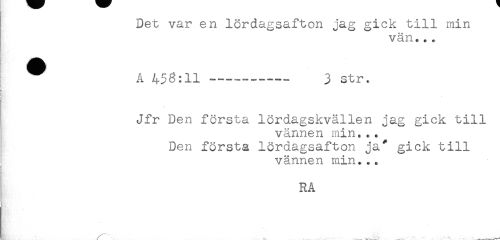 //// H'" //// Det var en lördagsafton jag gick till min //// vän... //// ^ A 458:11----- 3 str. //// i //// Jfr Den första lördagskvällen jag gick till //// vännen min... //// Den första lördagsafton ja* gick till //// vännen min... //// t //// RA ////