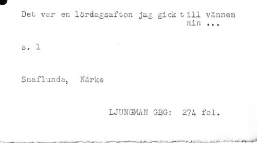 //// Det var en lördagsafton jag gick t ill vännen //// min ... //// s. 1 * //// Snaflunda, Närke //// LJUNGMAN GBG; 274 fol. ////
