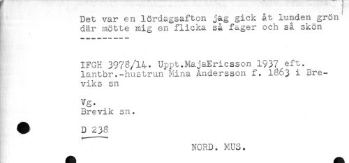 //// Det var en lördagsafton jag gick åt lunden grön //// där mötte mig en flicka så fager och så skön //// IFGH 3978/14. Uppt.MajaEricsson 1937 eft. //// lantbr.-hustrun Mina Andersson f. 1863 i Bre- //// viks sn //// Vg. //// Brevik sn. //// NORD. MUS. ////