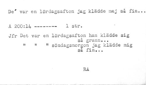 //// De* var en lördagsafton jag klädde mej så fin... //// A 200:14 —--- 1 str. //// Jfr Det var en lördagsafton han klädde sig //// så grann... //// " " " söndagsmorgon jag klädde mig //// så fin... //// RA ////