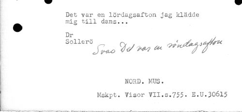 //// Det var en lördagsafton jag klädde //// mig till dans... //// Dr //// NORD. MUS. //// Mskpt. Visor VII.s.755- E.U.30615 ////
