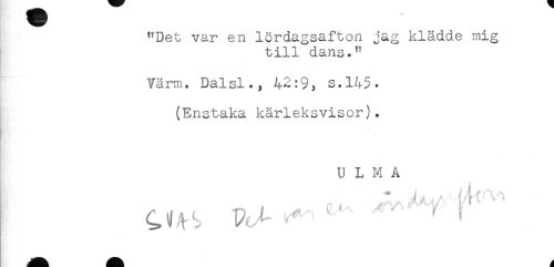 //// "Det var en lördagsafton jag klädde mig //// till dans." //// Värm. Dalsl., 42:9, s.145. //// (Enstaka kärleksvisor). //// ! //// U L M A //// ^ i? <å ^ //// ^ ^ <% # - T*- //// PJ- ''' '' ' i ////